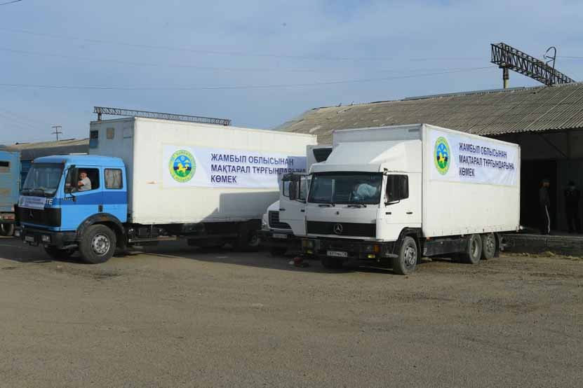 Жамбылские предприниматели отправили 10 тонн муки, 10 тонн риса, 5 тонн сахара, 1 тонну гречки, 2 тонны растительного масла, 2 тонны макаронных изделий, 5 тонн гигиенических средств.
