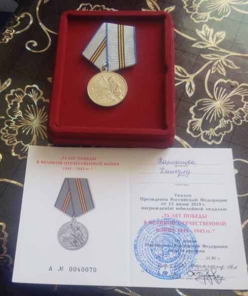 Таңның атысынан күннің батысына дейін тынымсыз еңбек етті. Соғыс жылдарындағы есіл еңбегі бағаланып 2015 жылы «Ұлы Отан соғысының тыл еңбеккері» медалімен наградталса, биыл Ұлы Жеңістің 75 жылдығына орай Ресей Федерациясының Президенті В.Путиннің жарлығымен арнайы мерекелік медальмен марапатталып отыр. Соғыстан кейінгі қиын-қыстау жылдары да шаруадан қол үзбеген кейуана талай мадақтау алған.