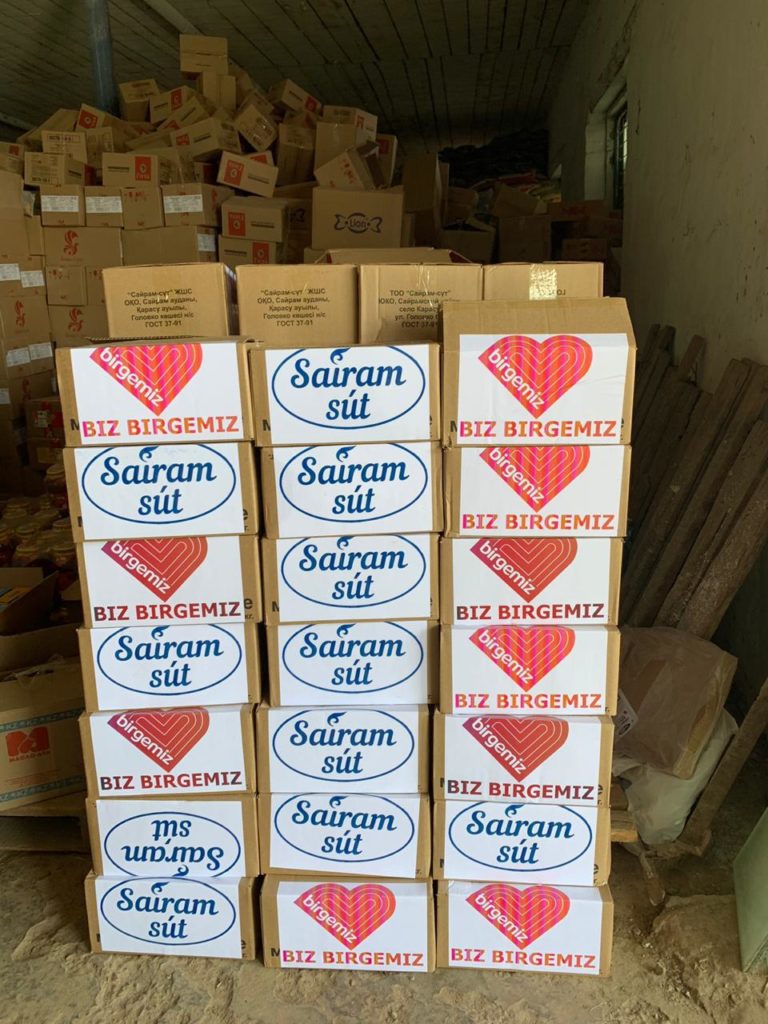 Гуманитарлық көмектің көптеп келуіне байланысты бір қойма тауарға толған. Қазіргі таңда екінші қойма белгіленіп, азық-түліктер сонда жинақталуда. Қоймаға жауапты , облыстық ардагерлер кеңесі төрағасының бірінші орынбасары Кенжехан Төлебаевтың айтуынша, қазіргі жиналған гуманитарлық көмектер алдағы екі-үш айға жетуі тиіс. Пункттерден бөлек, жекелеген туыстарының үйінде жатқан тұрғындар үшін Атакент елді мекенінде екі тарату орындары жұмыс істеуде. Олар №9 мектеп пен Комарова мектебінде орналасқан. Су басқан 5 ауыл тұрғындары осы жерге барып, үйлеріне азық-түлік алуына болады.