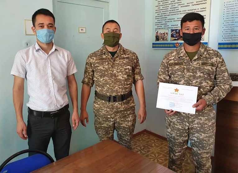 Майор Ербол Жұманов қоғамдық қауіпсіздікті қамтамасыз етуге белсене атсалысқан сарбаздарға, барлық карантиндік іс-шараларға қатысушыларға тыңғылықты жұмыстары үшін шынайы алғысын білдіріп, ел басына күн туған сын сағатта жасаған ерліктерінің өскелең ұрпақ үшін өнеге екендігін жеткізді.
