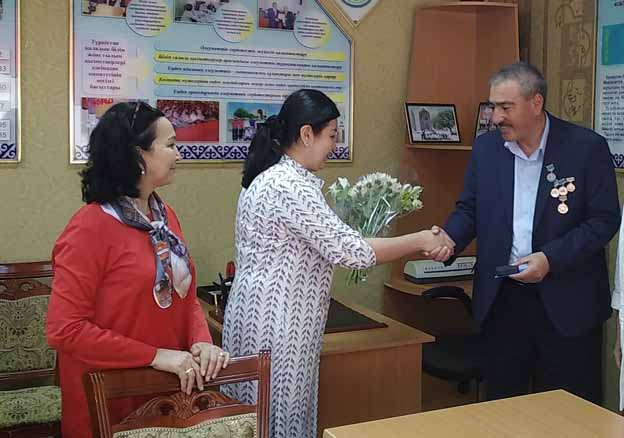 Таълим соҳасида хизмат қиладиган касаба уюшма аъзолари билан бугунда бажарилаётган иш бориши муҳокама қилинди. Фаол касаба уюшма аъзоларининг меҳнатини баҳолаш мақсадида Айгул Муқашева Туркистон шаҳридаги Ҳамза номидаги №2 умумий ўрта мактабининг бошланғич касаба уюшмаси ташкилотининг раиси Бахтиёр Абдураимовга “И.Алтинсарин” кўкрак нишонини топширди. Айгул Мақсат қизи ўз сўзида: “Устозларнинг мақомини ҳимоялашда фидокорона меҳнат қилиб, касаба уюшмаси аъзоларига янги қабулланган Қонунларни, Ҳукумат қабуллаган қарорларни, ечимларни ўз вақтида устозларга ўз даражасида етказиш, интернет саҳифаларига жорий этиб, фаоллик танитиш устозлар учун катта ёрдам” деб, касаба уюшмасининг барча ютуқларини, қонуниятларини тарғиб қилишда Бахтиёр Қаҳҳор ўғлининг ёш авлодга сифатли билим, онгли тарбия беришда самарали меҳнатларини тилга олди. Шунингдек, ҳар бир устознинг меҳнати баҳоланаверишига соҳа касаба уюшмаси мунтазам равишда ҳомийлик қилиб, назорат ҳамда раҳбариятни ҳам кучайтирадиганлигини айтди.
