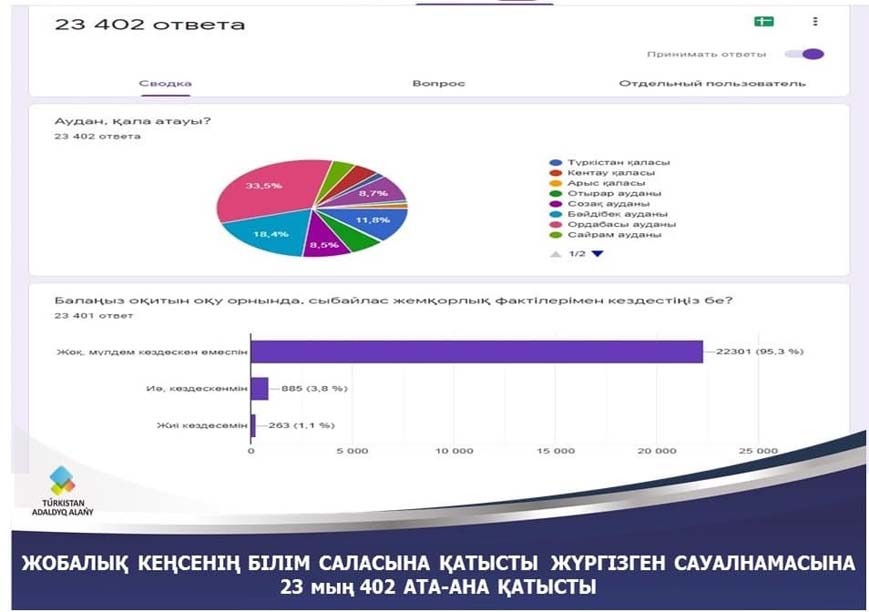 ҚР Сыбайлас жемқорлыққа қарсы іс-қимыл агенттігінің Түркістан облысы бойынша Департаментінің жанынан құрылған “Түркістан – Адалдық алаңы” жобалық кеңсесінің бастамасымен облысқа қарасты білім беру ошақтарының оқушылары мен студенттерінің ата-аналары арасында екі апта мерзім ішінде «Білім саласы – ата-ананың көзімен» тақырыбында онлайн сауалнама жүргізілді.