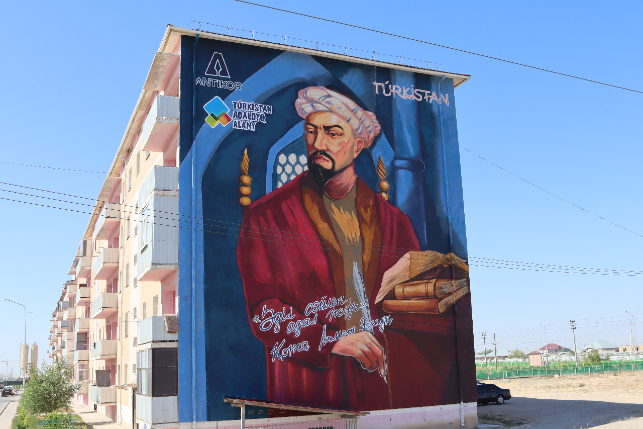 Түркістан қаласына қарасты “Отырар” ықшам ауданындағы көпқабатты тұрғын үйдің қабырғасына салынған муралда қазақ даласының төл перзенті, түркі халықтарының ұлы ойшылы Қожа Ахмет Ясауидың бейнесі кескінделген. Көз тартар композицияның негізгі ерекшелігі – биіктігі 15 метрді құрайтын мурал ұлы ақынның “Әділ сөйлеп, адал жүр” деген терең тәрбиелік мазмұнға ие даналық сөзіне негізделіп салынған.