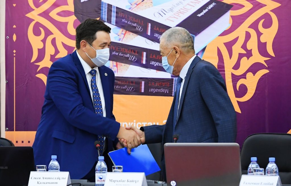 Түркістан өңіріндегі тарихи маңызы бар қасиетті жерлерді насихаттаудағы әдеби шығармалардың рөлі, мүмкіндіктері мен әлеуетін жан-жақты талқылау, қастерлі құндылықтарымызды көпшілік аудиторияға әдеби, тарихи және публицистикалық тұрғыда жеткізудің тың жолдарын қарастыру мақсатында өткен шара барысында жазушы, Халықаралық «Алаш» әдеби сыйлығының иегері Мархабат Байғұттың Халықаралық Түркі академиясының қолдауымен жарық көрген «Түркілер төрі Түркістан» кітабының таныстырылымы өтті.