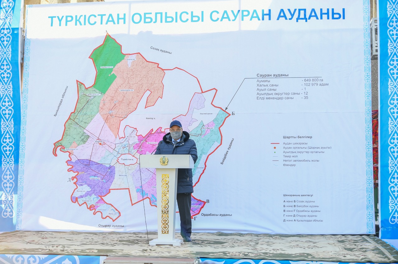ҚР Президенті Қасым-Жомарт Тоқаев Түркістан облысында Сауран ауданын құру туралы Жарлыққа қол қойды. Аудан орталығы Шорнақ ауылы болатын жаңа ауданның әкімшілік-аумақтық құрамына Шаға, Жаңа Иқан, Ескі Иқан, Үшқайық, Иассы, Оранғай, Қарашық, Жүйнек, Бабайқорған, Шорнақ, Жібек жолы, Майдантал ауылдық округтері кіретін болды.”Түркістан қаласының іргесінен жаңа аудан құруға ұйытқы болған Елбасымыз Нұрсұлтан Назарбаевқа, Қазақстан республикасының Президенті Қасым – Жомарт Тоқаевқа барша Сауран ауданының жастары атынан шексіз алғыс айтамыз. Елге, жерге қызмет етуге шақырамын”,- деді Сауран жалпы орта мектебінің мұғалімі Ердәулет Бұхарбаев.
