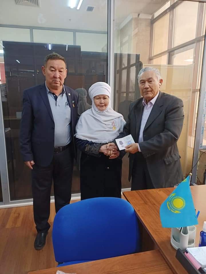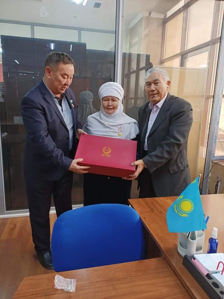 Қоғамдық естелік медалін ардагерлер кеңесінің төрағасы Жарқынбек Құлбайымбетов пен оның орынбасары Бақытжан Бейсембаев тапсырды.