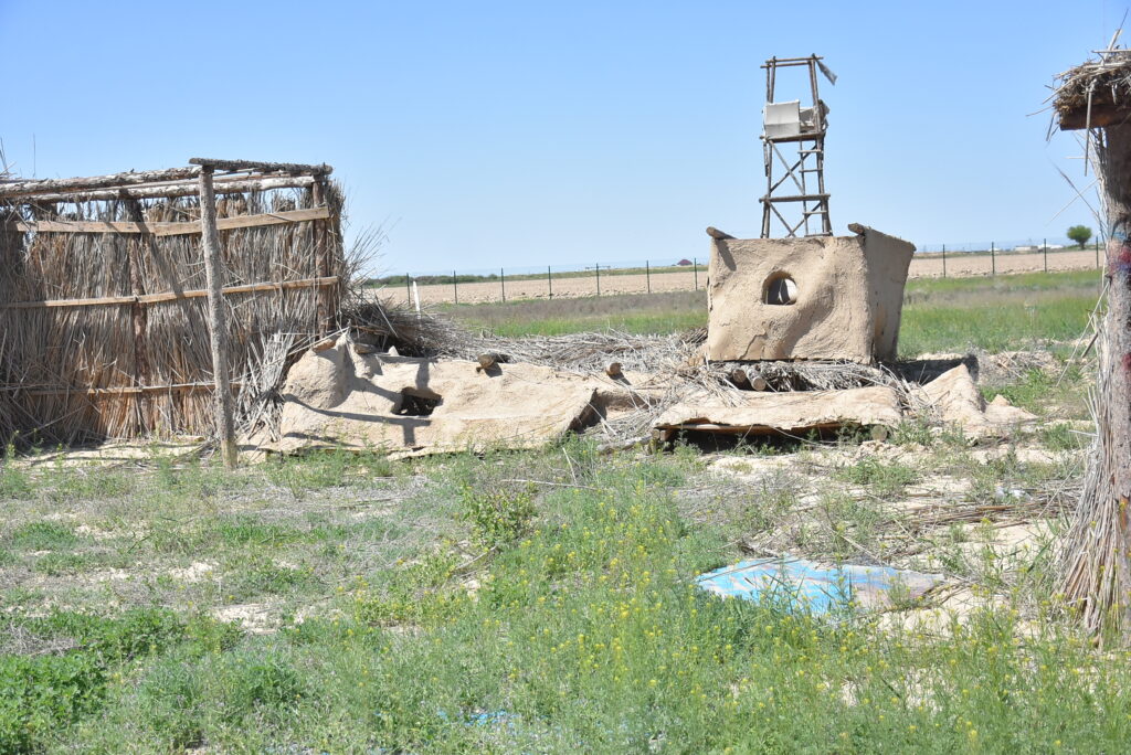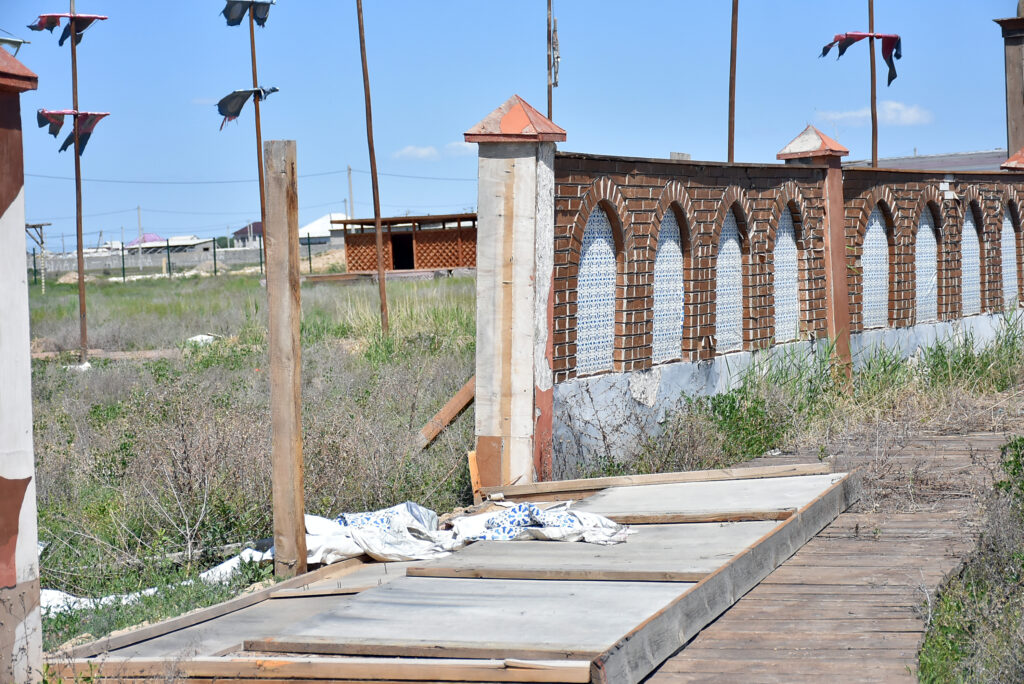 Жау шапқандай жайраған этноауылдың қақпасы айқара ашық. Саяхатшылар жүретін тақтай жолдардың арасына дейін арам шөптер мен қамыс қаулап өсіп кеткен. Кіре берістегі қақпаның қабырғаларының бояулары түсіп, дуалдары етпетінен құлаған.