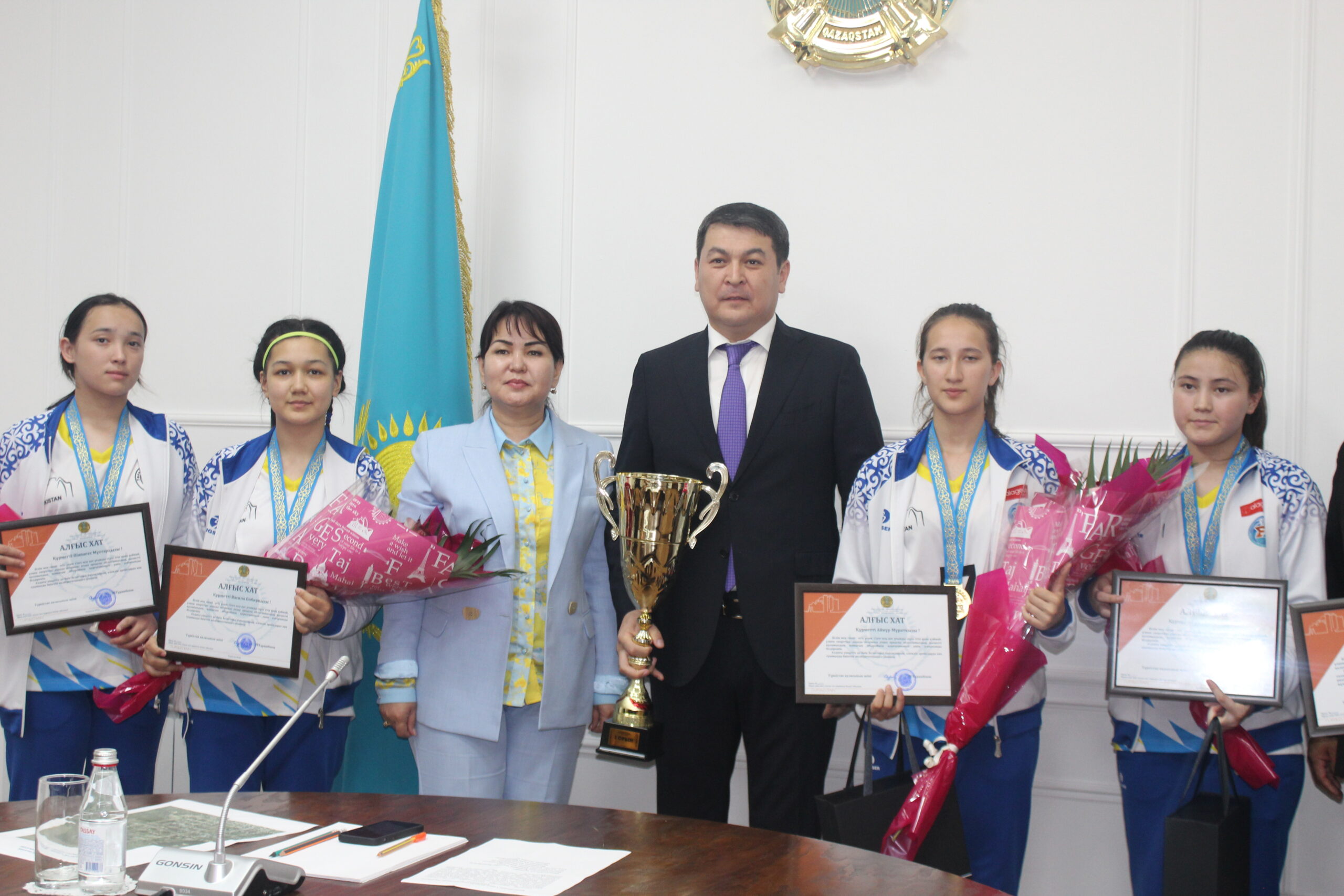 Қабылдауға келген мектеп директоры Алтынбек Момбеков, жаттықтырушы Бобир Файзуллаев және спортшы қыздар Шапағат Мұқтарқызы, Василя Бобирқызы, Айнұр Мұратқызы, Гүлсара Рахимбайқызын әкім арнайы Алғыс хаттармен марапаттап сый-сыяпаттар табыстады. Қала басшысы жеңімпаздарға сәттілік тілеп, осындай жеңістердің көптеп болуы үшін аянбай жаттығу керек екендігін айтты. Жерлестерімізді мараппаттарымен шын жүректен құттықтаймыз.