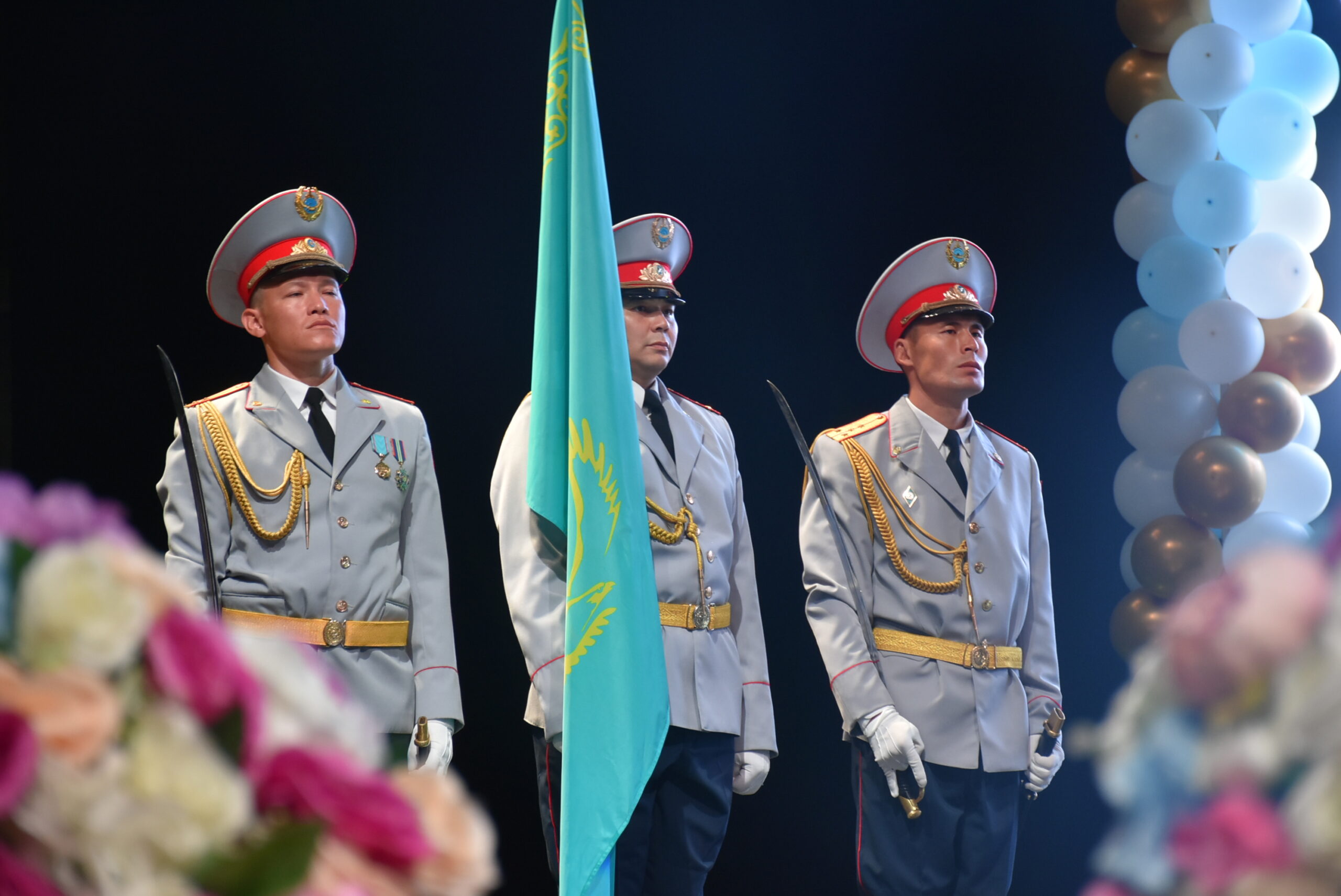 Шара Түркістан облысы Полиция департаментінің полицейлерінің қызметі мен ерлігі көрсетілген мерекелік бейнероликпен бастау алып, ҚР Мемлекеттік туы құрметпен сахнаға шығарылды. Әнұран шырқалып, жиынға қатысушылар ПД-де қызмет етіп, жұмыс барысында қаза тапқан полиция қызметкерлерінің рухына бас иіп, тағзым етті.
