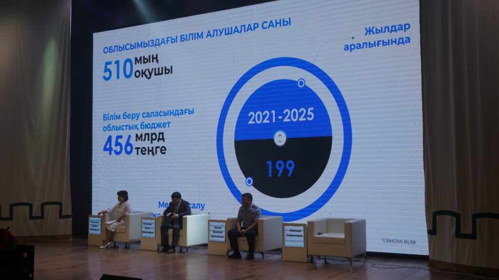 «Облысымызда 510 мыңнан аса оқушы білім алады. Бұл Республикадағы ең үлкен көрсеткіш, әрбір 7-ші бала Түркістан облысында білім алады деген сөз. Түркістан облысы республика бойынша білім беру саласына бөлінетін қаржы көлемі жағынан бірінші орында. Атап айтқанда, салаға 456 млрд.тнг бөлінген. 2021-2025 жылдар аралығында үш ауысымды және апатты мектептердің мәселесін, мектептердегі оқушы орнының тапшылығын жою мақсатында облыста кезең-кезеңімен 199 мектептің құрылысын салу жоспарланған. Өткен жылы 77 мектеп салынса, ағымдағы жылы 34 мектептіңқұрылысы аяқталып, жыл соңына дейін беріледі. Сонымен қатар, мемлекеттік бюджеттен бөлек орта білім саласын жеке сектордың инвестициялауы арқылы дамыту қарқынды жүргізілуде. 2021 жылмен салыстырғанда жекеменшік мектептер саны 17 артып (31%), бүгінгі таңда облыста 56 жекеменшік мектептер жұмыс істеуде. Жекеменшік мектептер есебінен оқушы тапшылық орындары шешілуде», деді Түркістан облысы адами әлеуетті дамыту басқармасының басшысы Дінислам Болатханұлы.