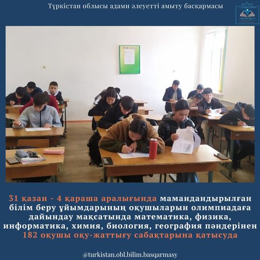 Ағымдағы жылдың 31 қазан – 4 қараша аралығында мамандандырылған білім беру ұйымдарының оқушыларын олимпиадаға дайындау мақсатында математика, физика, информатика, химия, биология, география пәндерінен 182 оқушы оқу-жаттығу сабақтарына қатысуда. Оқу-жаттығу сабақтары төмендегі мектеп базаларында өткіп жатыр. Атап айтсақ: