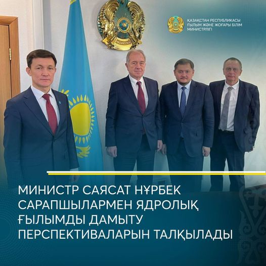 ҚР Ғылым және жоғары білім министрі Саясат Нұрбек Біріккен ядролық зерттеулер институтының өкілдерімен кездесті. Кездесу аясында Қазақстанда ядролық ғылымды дамыту перспективалары талқыланды.Кездесуге Біріккен ядролық зерттеулер институтының вице-директоры Лъчезар Костов, Бас ғылыми хатшысы Сергей Неделько, «Ядролық физика институты» РМК бас директоры, ҚР Үкіметінің БЯЗИ-дағы өкілетті өкілі Саябек Сахиев, БЯЗИ ҚР ұлттық тобының жетекшісі Ержан Мұхамеджанов, «Ядролық физика институты» РМК ғылыми қызметкері Әділжан Серіков қатысты.Министр Саясат Нұрбек Қазақстан ғалымдары институтпен ынтымақтасып, ядролық физиканың қазіргі заманғы мәселелері бойынша ірі халықаралық бағдарламаларға қатысып жатқанын атап өтті.