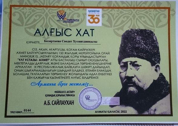 MANGILIK EL JASTARY қоғамдық қоры ұйымдастырған “ҰЛТ ҰСТАЗЫ-АХМЕТ” атты бастауыш сынып оқушыларына арналған Республикалық байқауға шәкірт дайындап, жүлделі І орынды Махаммаджанова Дурдона иеленді. Жетекшісі: Базартаева Саодат Хуснитдиновна