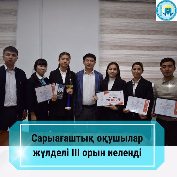 Сарыағаш ауданының адами әлеуетті дамыту бөліміне қарасты “№68 Т.Оспанов атындағы жалпы орта білім беретін мектебі” оқушылары жүлделі ІІІ орынға ие болды. 10-сынып оқушысы Бердібек Салтанат Жәнібекқызы. 18 команданың ішінен ең үздігі атанды.