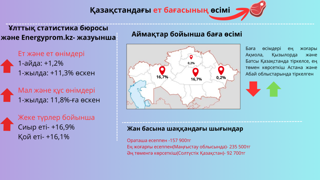 2025 жылдың маусымындағы баға статистикасы нарықтағы күшті инфляциялық қысымды көрсетеді. Ет және ет өнімдерінің жалпы бағасы бір айда 1,2%-ға, ал бір жылда 11,3%-ға өсті. Бұл, әсіресе, негізгі тағам болып саналатын мал еті мен құс етінің бір жылда 11,8%-ға қымбаттауы арқылы сезіледі. Energyprom.kz талдауы неғұрлым «ауыр» деректерді ұсынады: жылдық көрсеткіш бойынша сиыр еті 16,9%-ға, ал қой еті 16,1%-ға қымбаттаған. Бұл біздің дәстүрлі тағамдарға қолжетімділікті айтарлықтай қиындатады. Баға өсімі барлық аймақта бірдей емес. Ең жоғары өсім Ақмола, Қызылорда және Батыс Қазақстан облыстарында тіркелсе, Астана мен Абай облысында өсім баяу болды (0,2%). Жылдық есепте, ең үлкен баға секірісі Ұлытау (18%) мен Ақмола (16,7%) облыстарында байқалды. Бұл айырмашылықтар логистикалық шығындардың әртүрлілігін, жергілікті өндірістің жеткіліксіздігін немесе мемлекеттік реттеу шараларының өңірлерде әркелкі жұмыс істеуін көрсетеді.