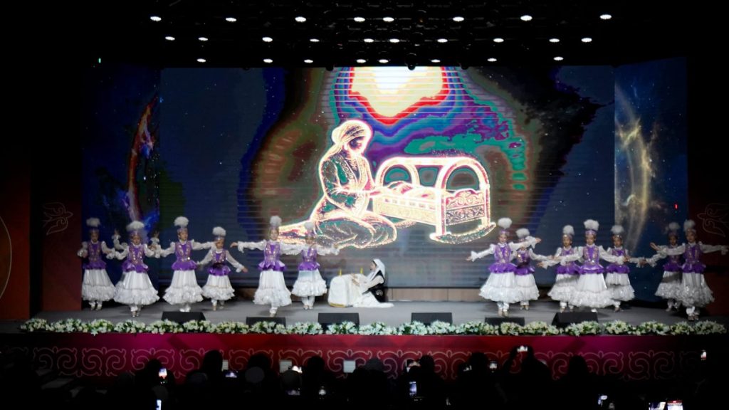 Мерекелік шара Р.Сейтметов атындағы Түркістан қалалық сазды-драма театры әртістері сахналаған әсерлі прологпен басталды. «Ана – өмір шуағы» деп аталған көрініс ананың мейірімі мен өмірдегі орны туралы терең ой салды. Сонымен қатар «Яссы» және «Әгугай» би ансамбльдері сахналық қойылым ұсынып, кештің көркін аша түсті. Көрермендерге заманауи 3D бейне мен жасанды интеллект көмегімен әзірленген көрнекі контент ұсынылып, мерекелік кеш ерекше форматта өтті.