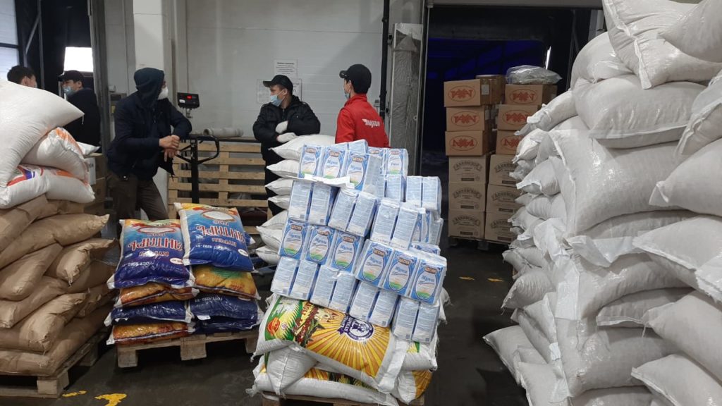 Әлеуметтік пакеттер өңір ерекшеліктеріне қарай азық-түлік себетінен, маскалар мен антисептіктерден, дәрі-дәрмектен, тұрмыстық химия заттарынан, балаларға бірінші кезекте қажетті заттардан құралды.
